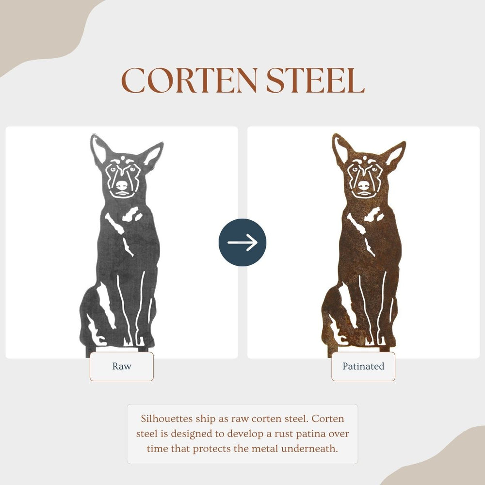 Metal Rescue silhouettes are handmade in the United States from sturdy 11 gauge premium weathering steel, also known as Corten steel. Each design is available in two different finishes- Corten steel and Black.