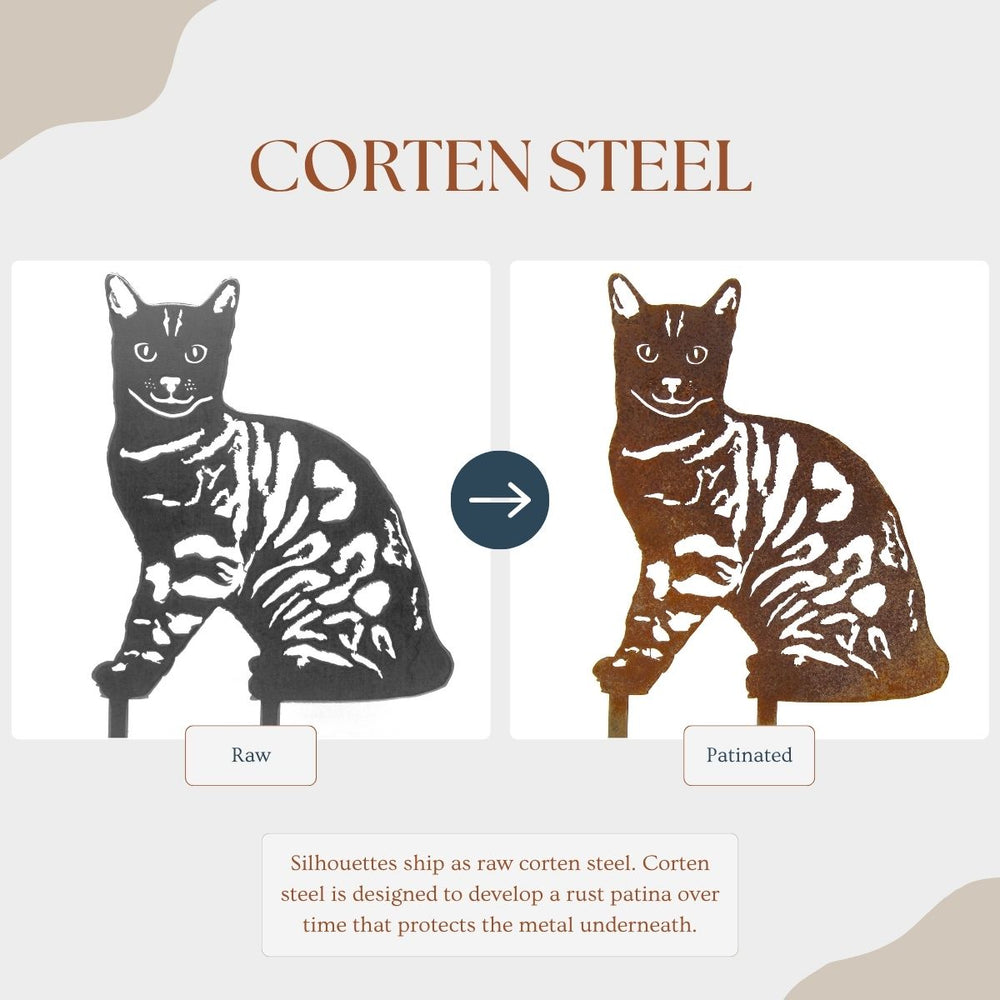 The Corten steel finish is designed to develop a beautiful patina rust coating that will change over time, protecting the steel underneath. These silhouettes ship out as raw steel and will develop a patina if left in the weather or frequently exposed to wet conditions. The color of the patina should change over time, starting as brighter orange tones and changing to darker brown tones.