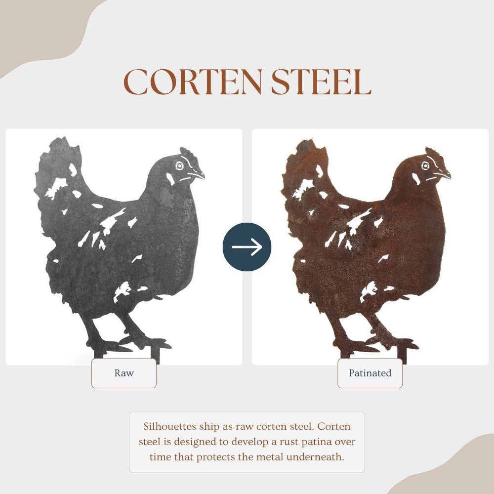 The Corten steel finish is designed to develop a beautiful patina rust coating that will change over time, protecting the steel underneath. These silhouettes ship out as raw steel and will develop a patina if left in the weather or frequently exposed to wet conditions. The color of the patina should change over time, starting as brighter orange tones and changing to darker brown tones.