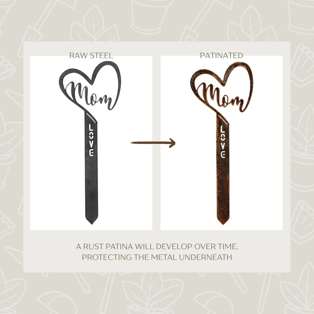 This Corten steel "mom" garden stake ships as polished steel and will rust when exposed to the weather.