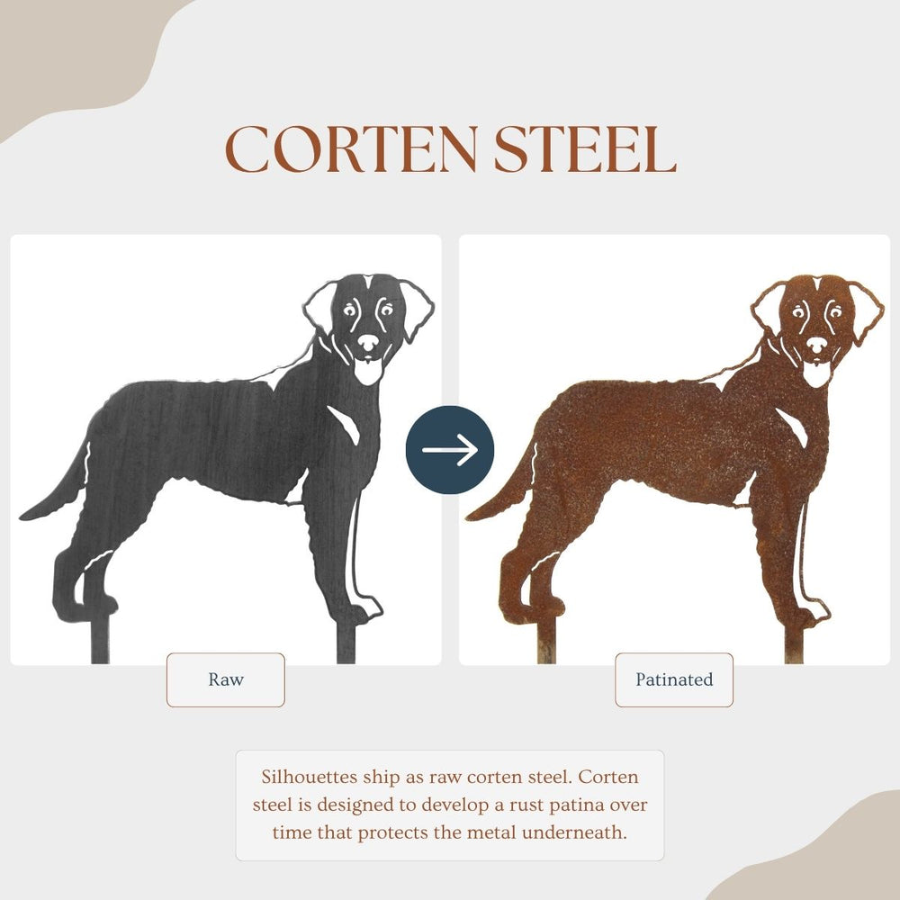 Metal Rescue silhouettes are handmade in the United States from sturdy 11 gauge premium weathering steel, also known as Corten steel. Each design is available in two different finishes- Corten steel and Black.