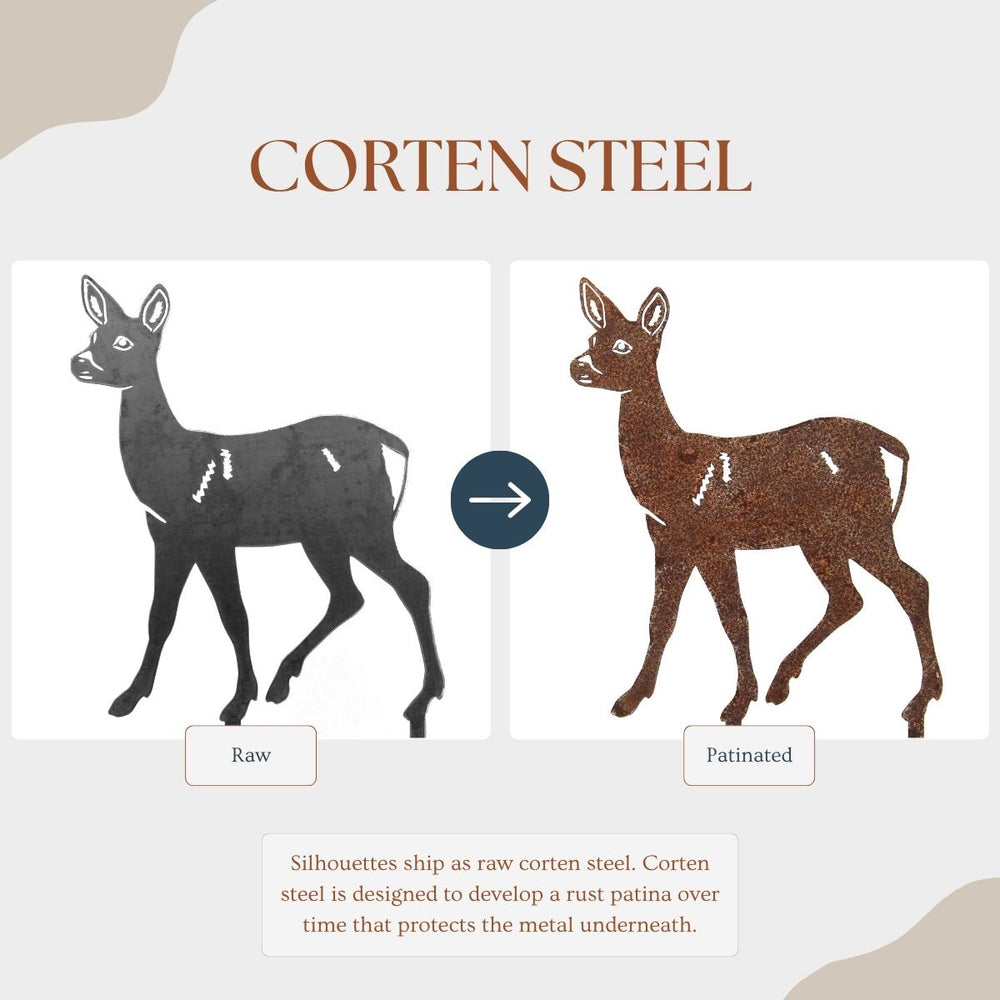The Corten steel finish is designed to develop a beautiful patina rust coating that will change over time, protecting the steel underneath. These silhouettes ship out as raw steel and will develop a patina if left in the weather or frequently exposed to wet conditions. The color of the patina should change over time, starting as brighter orange tones and changing to darker brown tones.