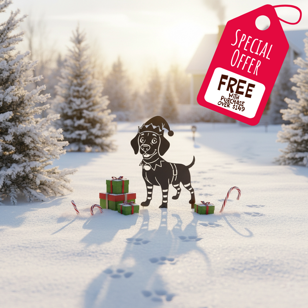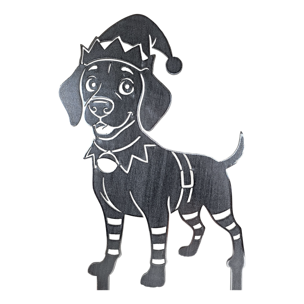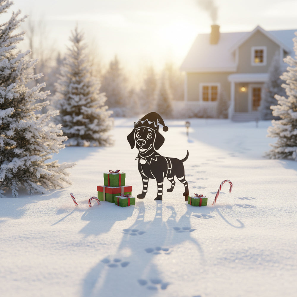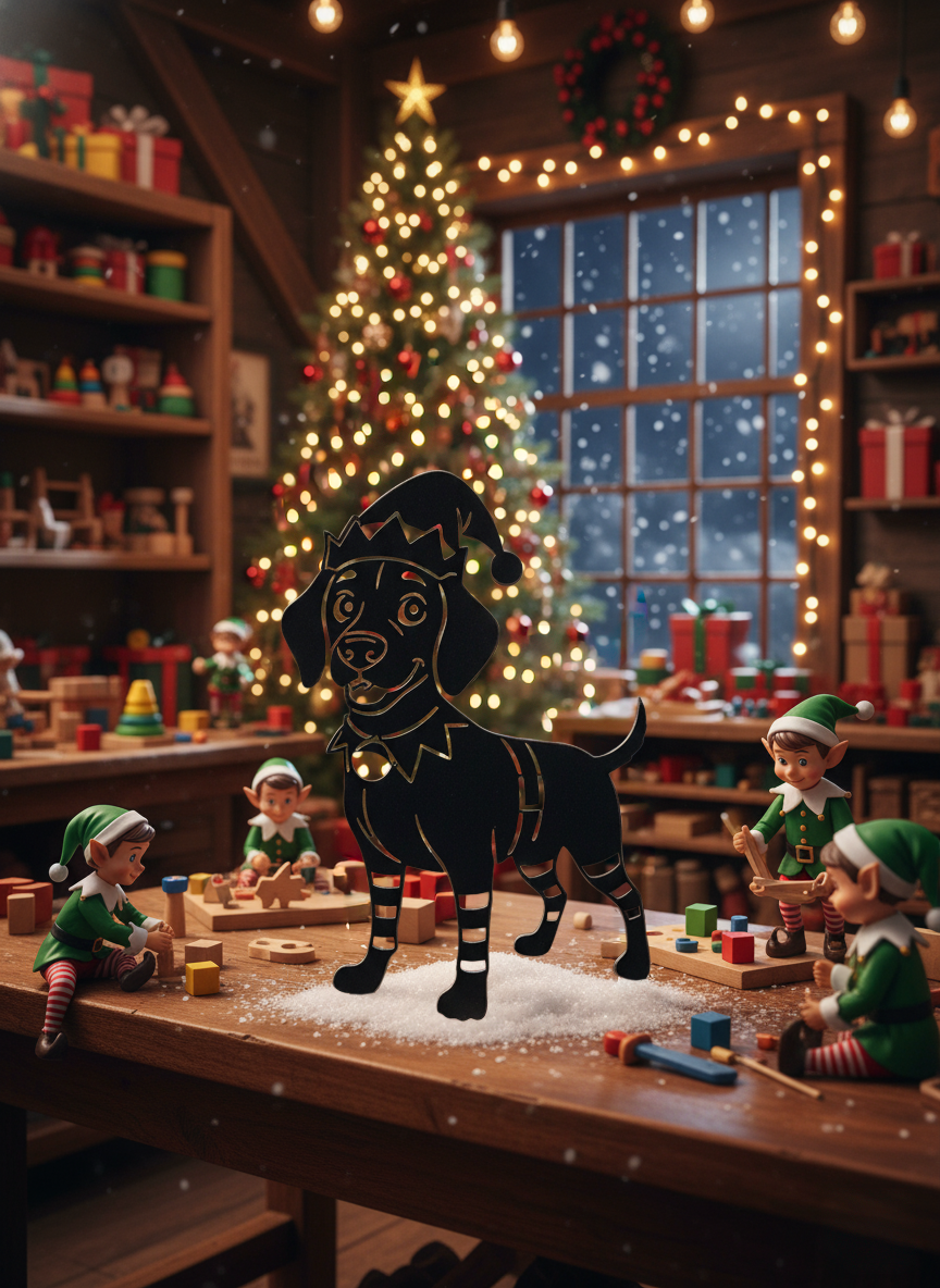 Straight from Santa’s workshop, Elf Dog has been busy wrapping presents and sneaking extra treats from the cookie tray. With striped stockings, a festive hat, and a big grin, he’s always first to volunteer for holiday mischief.