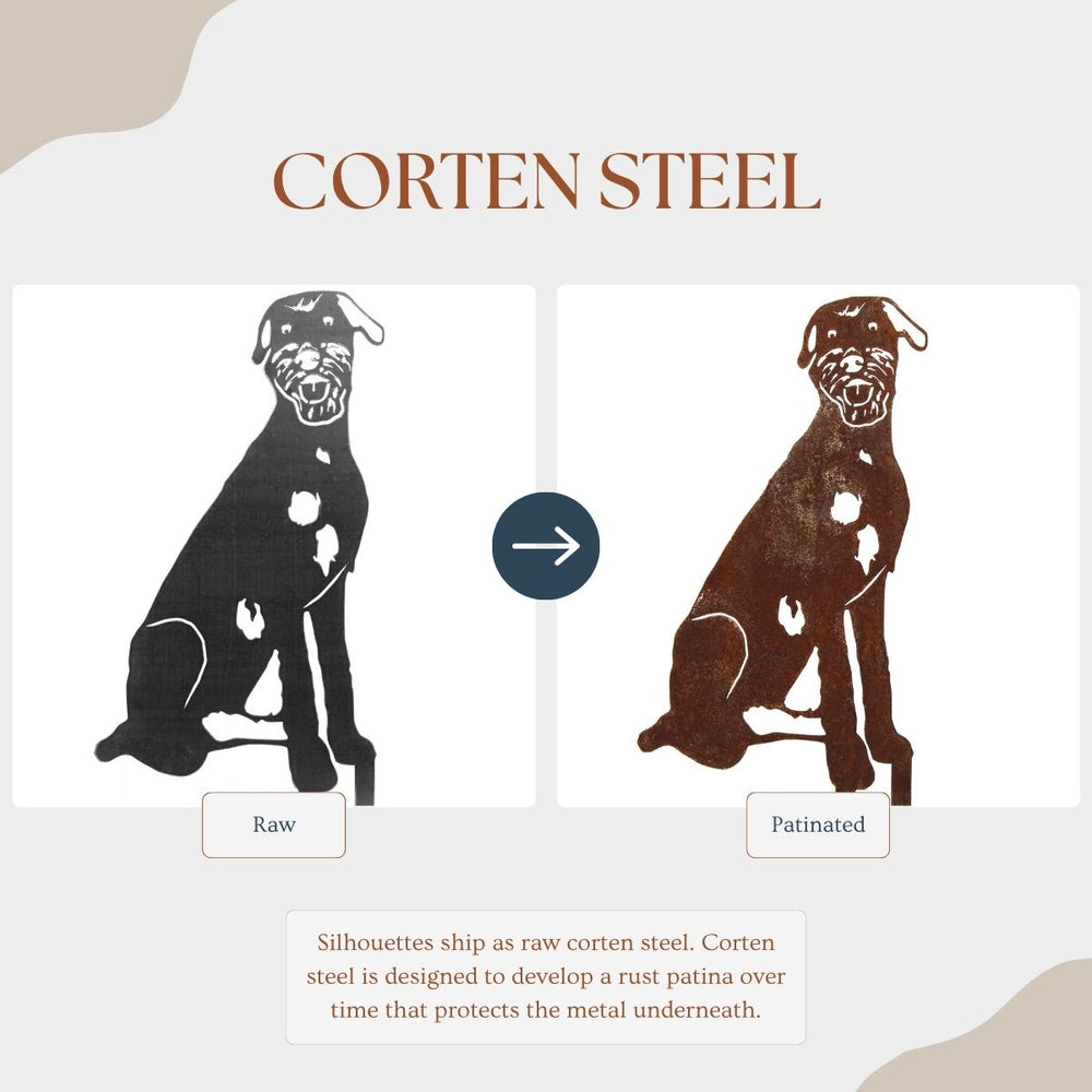 Metal Rescue silhouettes are handmade in the United States from sturdy 11 gauge premium weathering steel, also known as Corten steel. Each design is available in two different finishes- Corten steel and Black.