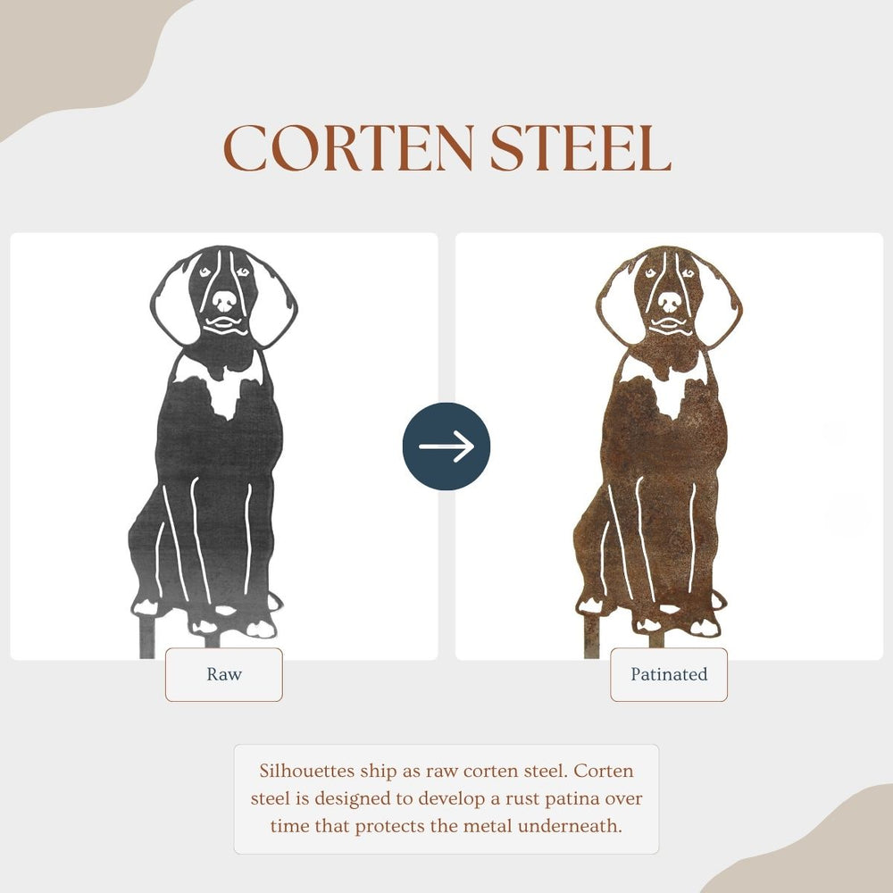 The Corten steel finish is designed to develop a beautiful patina rust coating that will change over time, protecting the steel underneath. These silhouettes ship out as raw steel and will develop a patina if left in the weather or frequently exposed to wet conditions. The color of the patina should change over time, starting as brighter orange tones and changing to darker brown tones.